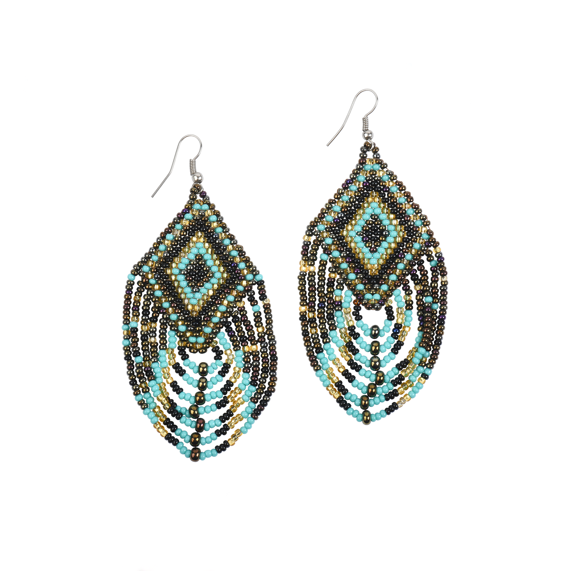 The ultimate earrings for the boho lovers! Hand beaded with love in Guatemala, the colors gold, black, and turquoise match our Gold & Turquoise Beaded Necklace.