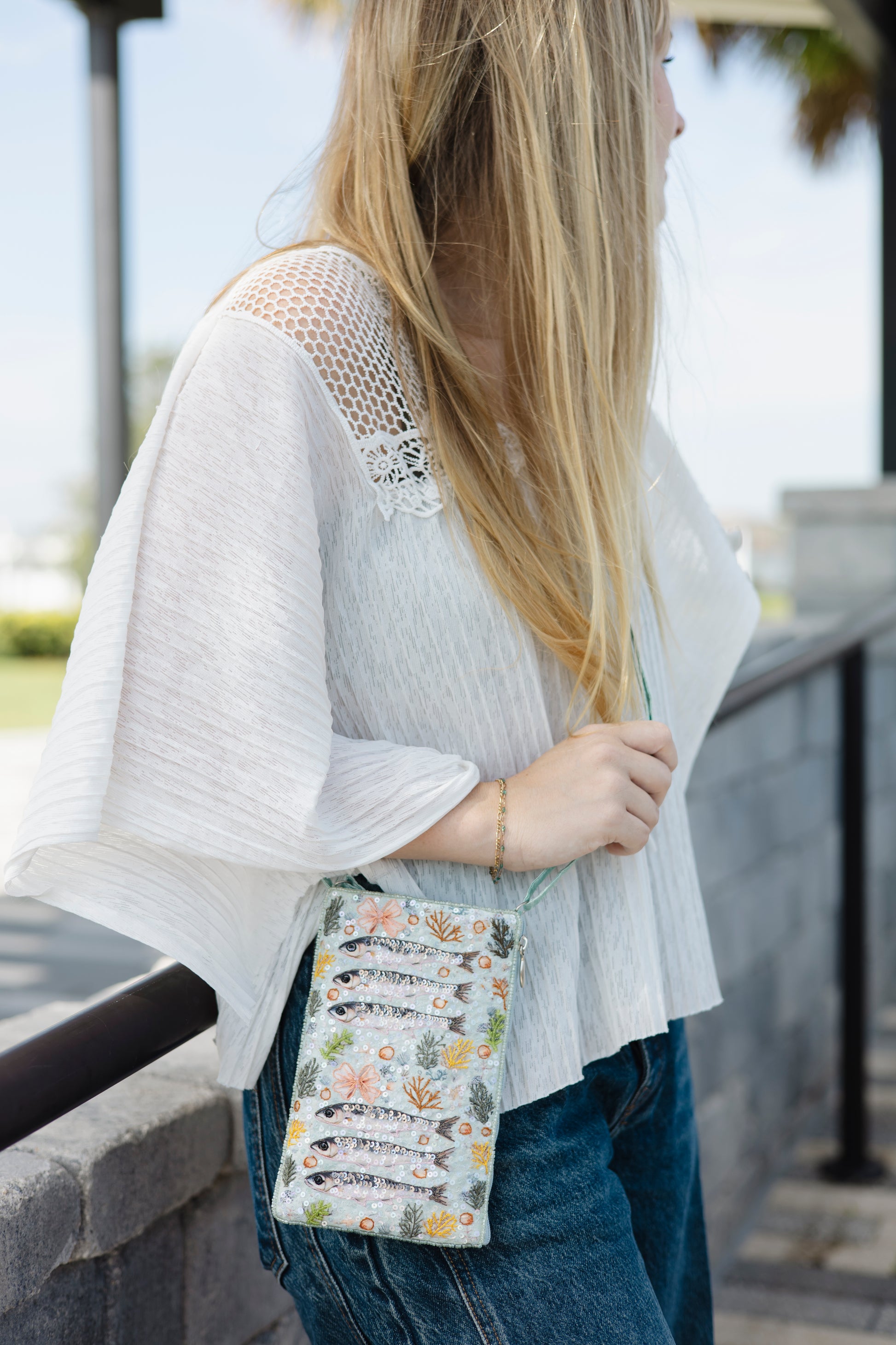 Hand beaded by artisans in India, this versatile bag can be used as a crossbody bag, wristlet, or unclipped by the strap to revamp into a purse on the go (just attach to belt loop or larger tote). Includes a convenient zipper enclosure on the side for easy access to cards or a cellphone. Each bag contains a 54" crossbody strap that can be tucked away when not in use.